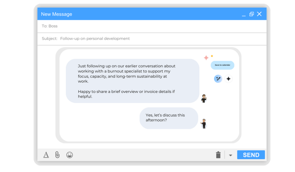 Just following up on our earlier conversation about working with a burnout specialist to support my focus, capacity, and long-term sustainability at work.